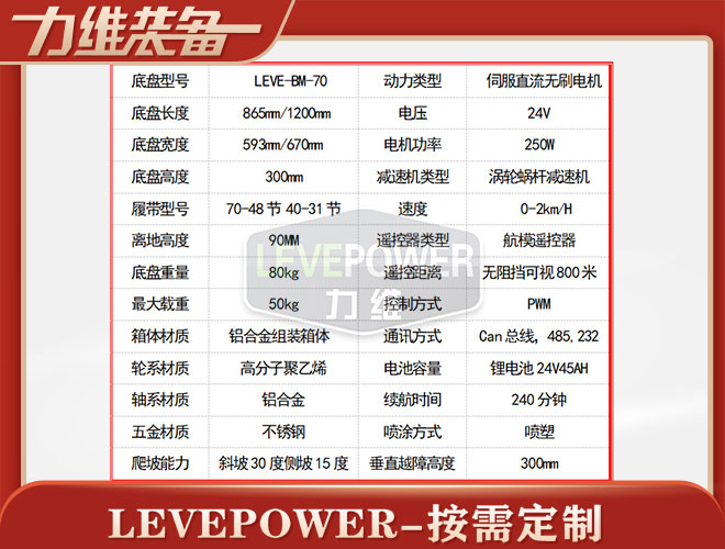該底盤主體履帶使用100mm寬耐磨橡膠履帶,外花紋橫紋設(shè)計,提高攀爬能力。擺臂履帶采用40mm寬度機器人橡膠履帶,底盤箱體經(jīng)過高溫噴砂噴塑防銹處理,主題底盤采用2個24v200w伺服直流無刷電機,擺臂采用1個24v200w伺服直流無刷電機,渦輪蝸桿減速機,可載重50kg,是一種操控既方便,有實用的底盤系統(tǒng),在不平坦的路面,爬坡,越障非常好用。是一款全地形底盤。電池采用24v45ah磷酸鐵鋰鋰電池,持續(xù)續(xù)航時間可達4個小時長時間續(xù)航。